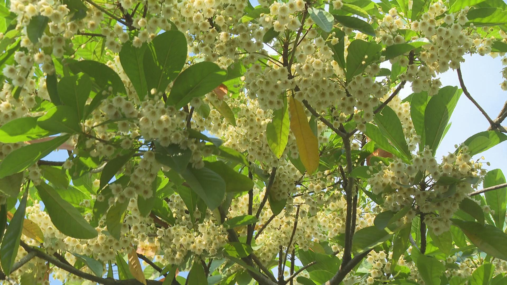 长芒杜英,四季常绿,枝条层层轮生,自下而上形成塔形的树冠,总状花序生于枝顶腋内,开花时节,花朵浓密,花瓣撕裂如流苏,淡黄色小花朵如同一串串小风铃,密密麻麻地悬垂于枝梢,迎风摇曳,并散发着奶油味的香气,惹人喜爱。